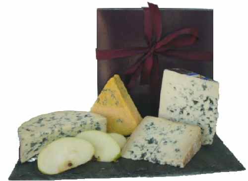 So many blue cheeses, so many choices, so many combinations possible. Our European Blue Cheese vary from origin, color, flavor, sharpness or texture and is packed in a Glossy Burgundy Gift Box with matching satin ribbon. Danish Blue or Danablue has a milk white pase with very blue veins and a irregularly distributed holes. It is semi-soft, a little crumbly and has a distinctively sharp and salty flavor (8 oz.) Fourme d'Ambert is an ancient French gourmet cheese from the Auvergne region and is made with raw cow's milk. The cheese is firm, has an ivory color with greenish-blue veining. It has an interesting aroma of roasted nuts and a fruity flavor (8 oz.). Shropshire Blue from the UK is made in exactly the same way as Stilton except that annatto is added to the milk with the starter culture and the mold to give the cheese it's bright orange color. The texture is firm and creamy, but also slightly crumbly. The flavor is sharper than Stilton and quite distinctive (5 oz.). The Spanish Valdeon is a cheese with a blue veined paste, made with a mixture of cow's or goat's milk. The paste has a soft texture and pale yellow color and is full of small cavities where a white and greenish blue mold. Its flavor is salty, pronounced, piquant and long lasting. Valdeon is greasy and buttery on the palate and very aromatic (8 oz.). Please note that we will substitute any item that is temporarily out of stock with a similar item of equal or greater value. Read more customer reviews ...